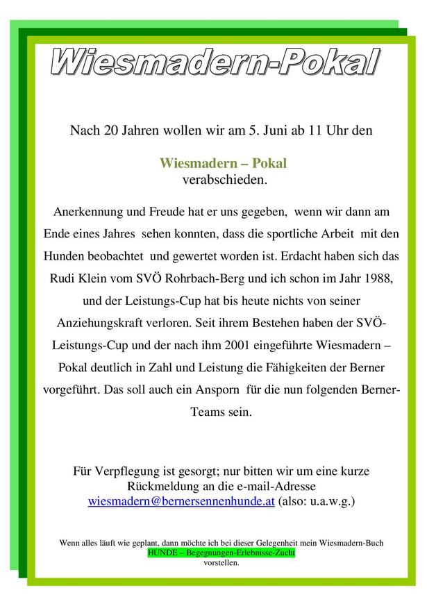 Der letzte WIESMADERN - POKAL gibt erneut ein respektables Bild von den Aktivitäten bei Sport und Show unserer herrlichen Rasse. Aussenstehende sind immer wieder erstaunt, dass Dr. Hans Räber die richtigen Worte fand als er schon 1981 in seinem Buch SCHWEIZER SENNENHUNDE schrieb: "Es gibt keine Prüfungsklasse in unserer Prüfungsordnung, die von einem Sennenhund nicht bewältigt werden kann“. Dank und Gratulation ergehen an alle Teilnehmer im abgelaufenen Jahr.