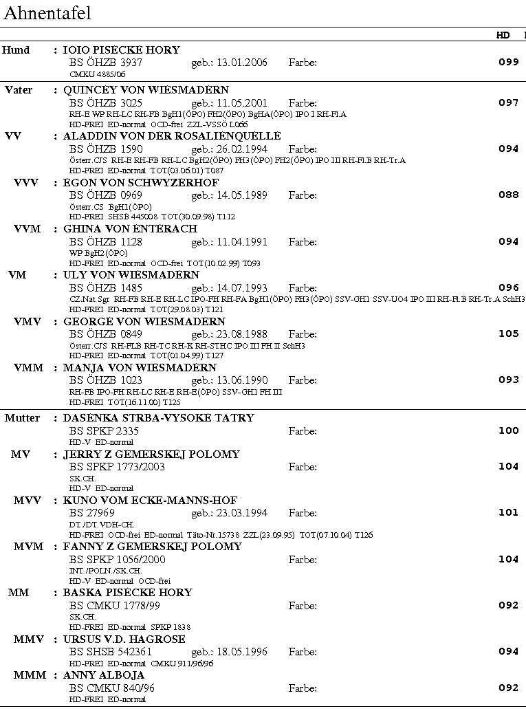 Austellungen: 2006: VSSÖ Zuchtschau Jüngstenklasse vielversprechend 2006: IHA Wieselburg Jugendklasse vorzüglich 2 2007: VSSÖ Klubschau Zwischenklasse sehr gut Ausbildung: BGH A 2009 Würfe: 2008 nach Caruso il fedele v. Haus Agnelli; 2 R, 2 H2010 nach Pablo v. Jauntal; 2 R, 2 H 2012 nach Ingo II v. Wiesmadern; 4 R, 1 H |