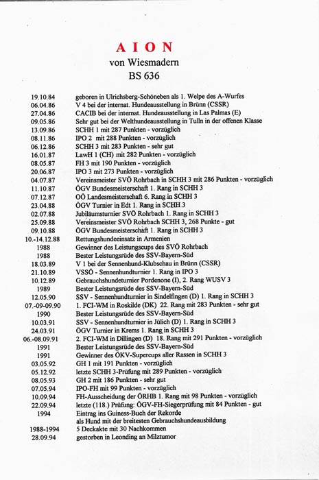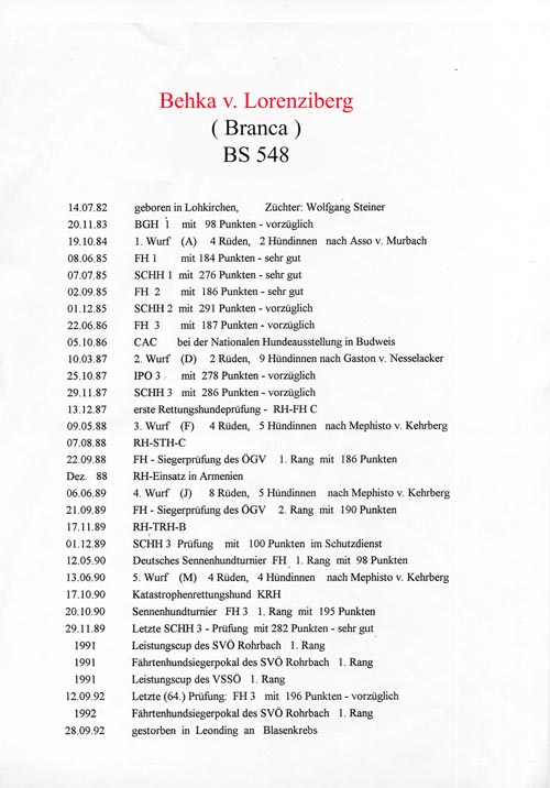 BS 750 20.2.87 - geboren in Biberach, Züchterin : Gundula Hoffmann 18.6.88 - Schutzhund-Prüfung 1 mit 279 Punkten - sehr gut 25.9.88 - Schutzhund-Prüfung 2 mit 251 Punkten - gut 2.10.88 - vorzüglich 2, Internationale Hundeausstellung Tulln 30.10.88 - Internationale Schutzhund-Prüfung 3 mit 268 Punkten - sehr gut 12.3.89 - vorzüglich 1, CACIB Internationale Hundeausstellung Nürnberg 15.4.89 - 1.Wurf (H) 4 Rüden, 7 Hündinnen nach Bertel v. Blumenland 8.10.89 - vorzüglich 1, CACA Bundessieger-Ausstellung Tulln 21.10.89 - Katastrophenschutz-Prüfung vorzüglich 12.3.90 - 2.Wurf (K) 4 Rüden, 6 Hündinnen nach Aion v. Wiesmadern 13.5.90 - Obedience-Prüfung 1 mit 194 Punkten - vorzüglich 30.6.90 - Fährtenhund-Prüfung 3 mit 175 Punkten - sehr gut 21.10.90 - vorzüglich 2, VSSÖ Klubsiegerschau 7.9.91 - 3. Wurf (P) 2 Rüden, 3 Hündinnen nach Falk v.Wiesmadern 3.7.92 - Schutzhund-Prüfung 3 mit 272 Punkten - sehr gut 12.12.92 - Rettungshunde-Prüfung Flächensuche 283 Punkte - sehr gut 13.12.92 - Rettungshunde-Prüfung Fährtensuche 288 Punkte - vorzüglich 24.6.94 - Internationale Fährtenhund-Prüfung mit 94 Punkten - sehr gut 16.7.94 - ÖRHB-Fährtenhund-Siegerprüfung mit 88 Punkten - gut, Rg.4 18.9.94 - SVÖ-Fährtenhund-Bundesmeisterschaft mit 99 Punkten - vorz., Rg.2 17.2.95 - Rettungshunde-Prüfung Lawinensuche C mit 296 Punkten - vorz. 3.9.95 - ÖRHB-Fährtenhund-Siegerprüfung mit 93 Punkten - sehr gut, Rg. 3 22.11.96 - letzte (54.) Prüfung: Fährtenhund 3 mit 96 Punkten - vorzüglich 29.9.97 - gestorben in Ulrichsberg-Schöneben |