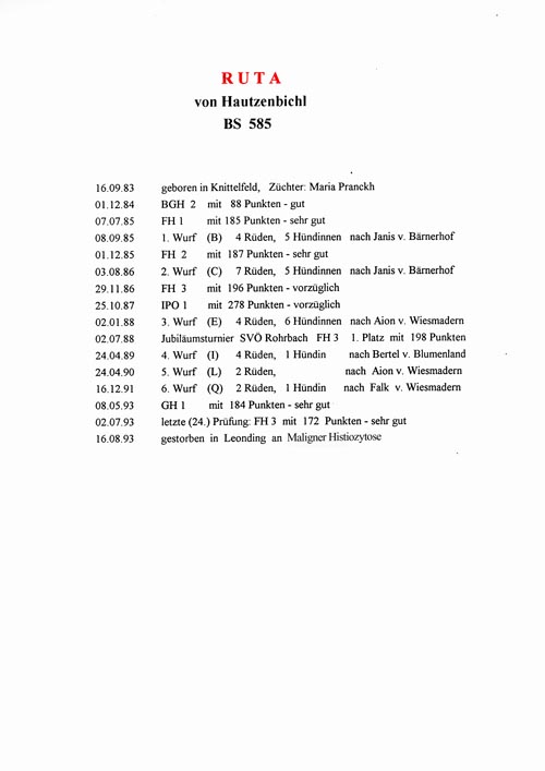 1023 13.6.90 - geboren in Ulrichsberg-Schöneben 4.10.91 - Fährtenhund-Prüfung 1 mit 169 Punkten - gut 23.2.92 - Lawinensuchhund-Prüfung A mit 273 Punkten - sehr gut 4.4.92 - sehr gut Internationale Rassehunde-Ausstellung Stuttgart 3.5.92 - Fährtenhund-Prüfung 2 mit 179 Punkten - gut 14.11.92 - 1.Wurf (T) 2 Rüden, 1 Hündin nach George v. Wiesmadern 8.5.93 - Obedience-Prüfung 1 mit 154 Punkten - befriedigend 14.7.93 - 2.Wurf (U) 3 Rüden, 6 Hündinnen nach George v. Wiesmadern 24.10.93 - Fährtenhund-Prüfung 3 mit 170 Punkten - sehr gut 4.6.94 - vorzüglich 1, Nationale Hundeausstellung Tabor 26.6.94 - Internationale Fährtenhund-Prüfung mit 94 Punkten - sehr gut 16.7.94 - Rettungshunde-Fährtenprüfung A mit 263 Punkten - gut 23.9.94 - 3.Wurf (W) 4 Rüden, 6 Hündinnen nach Domino v. Dörfli 17.2.95 - Lawinensuchhund-Prüfung B mit 262 Punkten - gut 18.2.95 - Lawinensuchhund-Prüfung C mit 285 Punkten - sehr gut 2.5.95 - 4.Wurf (X) 2 Rüden, 7 Hündinnen nach Vasko v. Wiesmadern 7.8.95 - Rettungshunde-Fährtenprüfung B mit 281 Punkten - sehr gut 3.9.95 - ÖRHB-Fährtenhund-Siegerprüfung mit 81 Punkten, gut Rg. 9 15.6.96 - 5.Wurf (Y) 3 Rüden, 8 Hündinnen nach George v. Wiesmadern 29.7.97 - 6.Wurf (D2) 1 Rüde nach George v. Wiesmadern 21.11.97 - letzte (42.) Prüfung: Fährtenhund 3 mit 80 Punkten - gut 16.3.98 - 7.Wurf (G2) 5 Rüden, 4 Hündinnen nach Aladdin v. d. Rosalienquelle 6.11.00 - gestorben in Ulrichsberg-Schöneben an Darmverschluß |