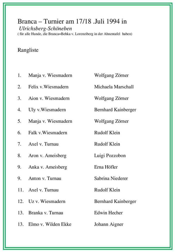 Rangliste Branca-Turnier (1.Wiesmadern-Turnier)