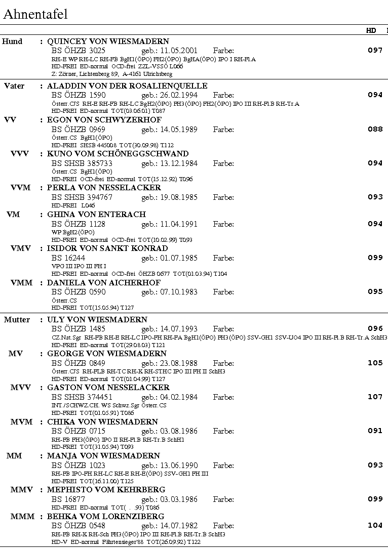 geb.: 11.5.2001 ÖHZB BS 3025 Ö-Champion HD-frei, ED-frei, OCD-frei, Zuchtzulassung seit: 13.4.2003, FCI-ÖKV-Gebrauchshundezertifikat seit 8.4.04 |